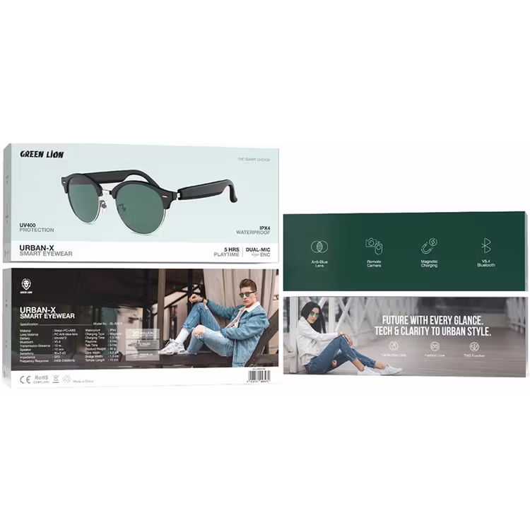 عینک هوشمند GREEN LION URBAN-X SMART EYEWEAR، ترکیبی بی‌نظیر از طراحی شیک و قابلیت‌های پیشرفته‌ی صوتی است. با این عینک هوشمند، می‌توانید به راحتی تماس‌های تلفنی خود را برقرار کرده و به موسیقی مورد علاقه‌تان گوش دهید.