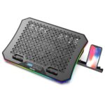این کولپد برای لپتاپهای 10 تا 19 اینچ مناسب است و با نورپردازی RGB LED (12 چراغ – هر فن 2 LED) جلوهای جذاب و گیمینگ به میز کار شما میبخشد.