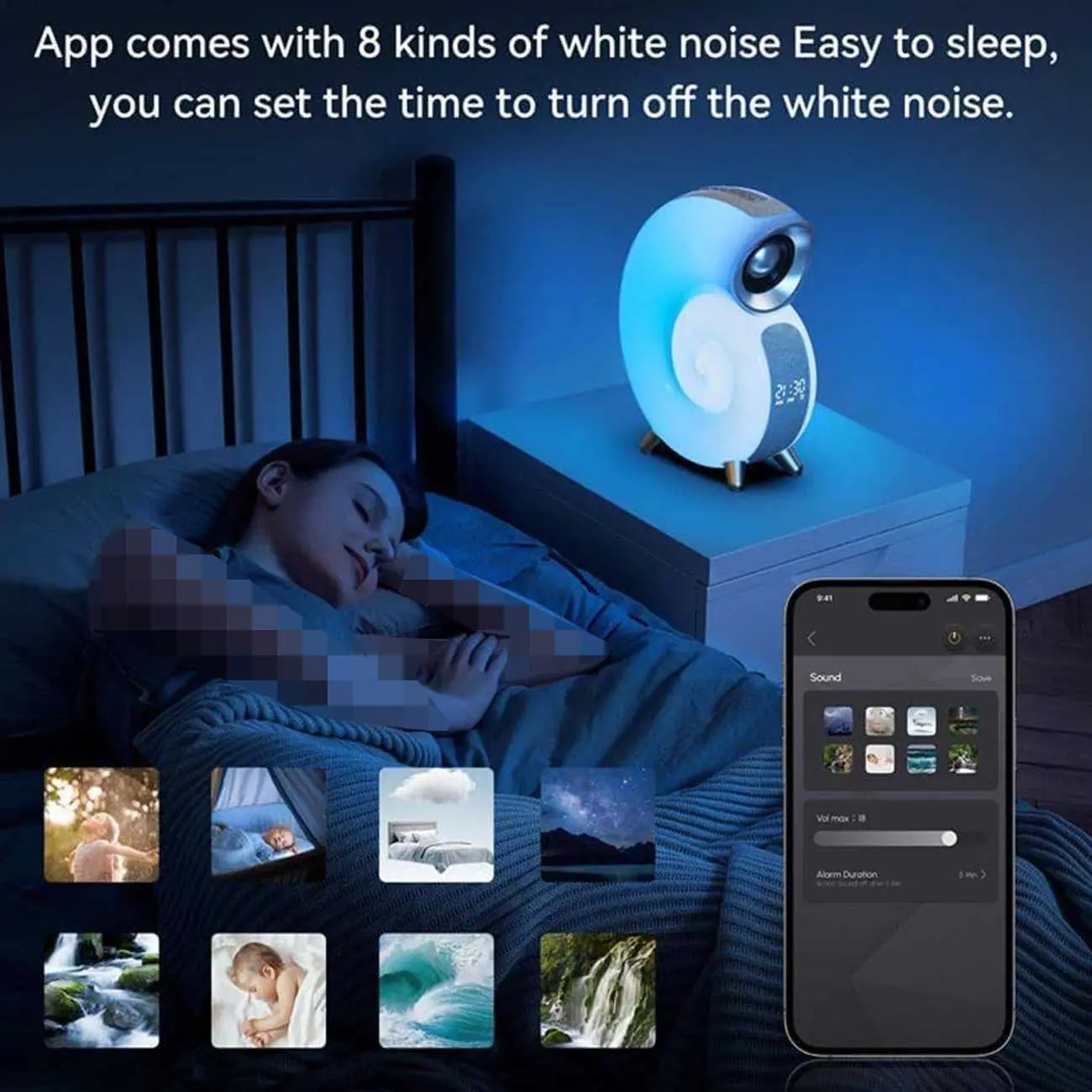 ساعت دیجیتال تعبیه شده روی چراغ صدفی حلزونی، نمایش دقیق زمان و آلارم قابل تنظیم را فراهم میکند. کاربران میتوانند از 4 حالت نوع موزیکال بیدار شدن استفاده کنند و با کنترل از طریق برنامه، زمان، صدا، حجم و نور زنگ را شخصیسازی کنند. پشتیبانی از 9 زبان مختلف این محصول را برای کاربران جهانی مناسب کرده است.