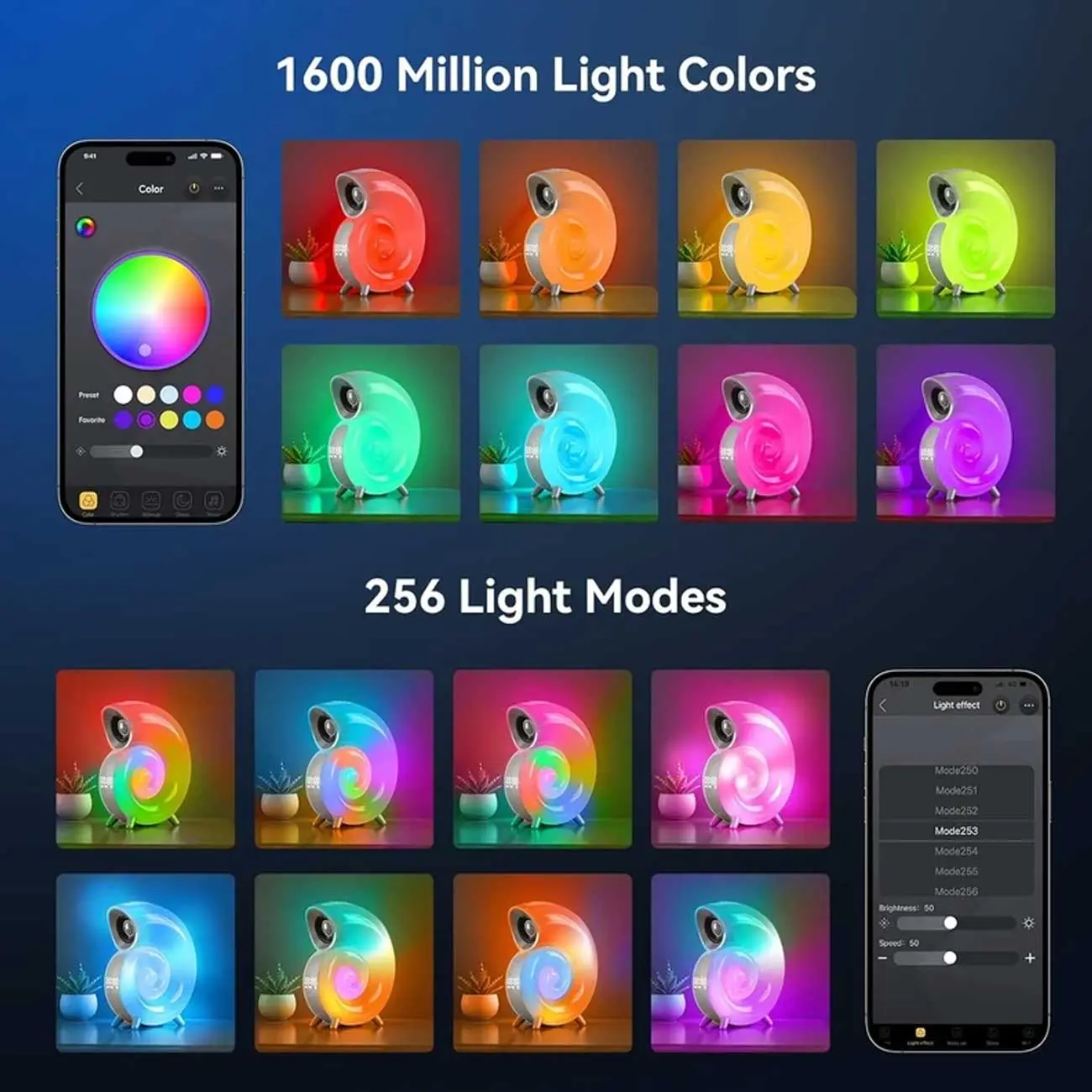 چراغ خواب فانتزی و اسپیکر رومیزی CONCH Music Light با 16 میلیون رنگ و 256 حالت نورپردازی، امکان تنظیم دلخواه نور برای هر محیط را فراهم میکند. نور به تدریج روشنتر یا تیرهتر میشود و با حساسیت نورپردازی به موسیقی و ریتم آهنگ هماهنگ میگردد. با کلیک روی دکمه لامپ میتوان بین 7 حالت رنگ روشن RGB جابجا شد و روشنایی نور به راحتی از طریق برنامه APP control تنظیم میشود. این چراغ هوشمند نیازهای نورپردازی شما را برای هر صحنه، از کار و مطالعه تا استراحت و خواب، برآورده میکند.
