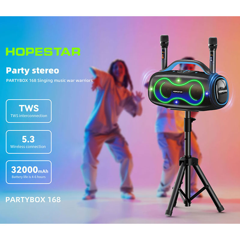 اسپیکر قابل حمل هوپ استار مدل PARTYBOX 168 یکی از قدرتمندترین محصولات برند هوپ استار است که با توان خروجی بالا (تا ۴۰۰-۴۵۰ وات) و فناوریهای نوین، تجربهای حرفهای از پخش موسیقی ارائه میدهد. این اسپیکر پارتی باکس هوپ استار با کیفیت صدای ۲۴ بیت و فناوری بهبود هوشمند AI، صدایی شفاف، عمیق و با باس قوی تولید میکند که برای مهمانیها، کارائوکه و gatherings outdoor ایدهآل است.
