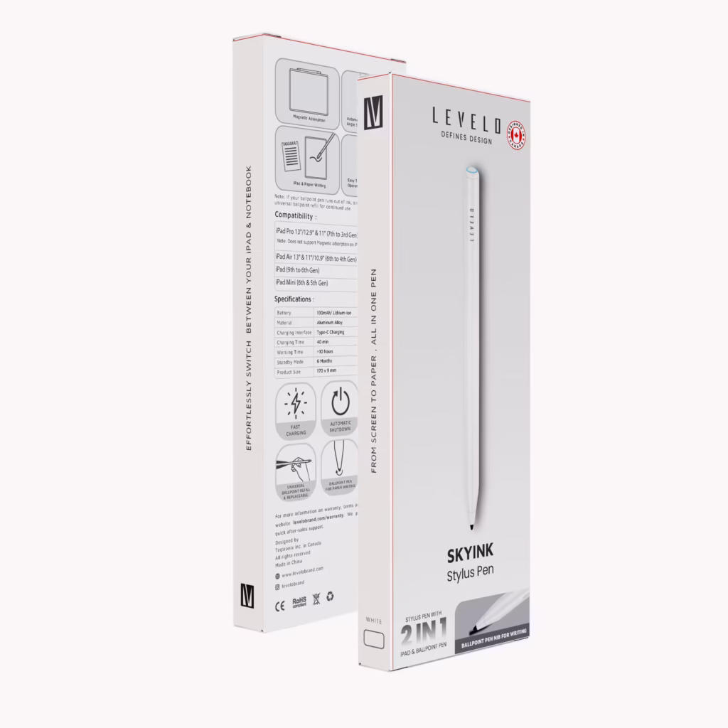 قلم LEVELO SKYINC STYLUS PEN & BALL POINT 2 IN 1 قلم دوکاره با نوک لمسی و جوهرافشان برای نوشتن روی تبلت و کاغذ است. این محصول با طراحی ساده مناسب دانشآموزان است.