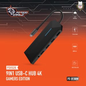 هاب Porodo PDX526 9In1 USB-C Hub 4K هابی ۹ در ۱ با خروجی HDMI 4K برای اتصال دستگاهها به لپتاپ است. این محصول با طراحی کوچک مناسب است.