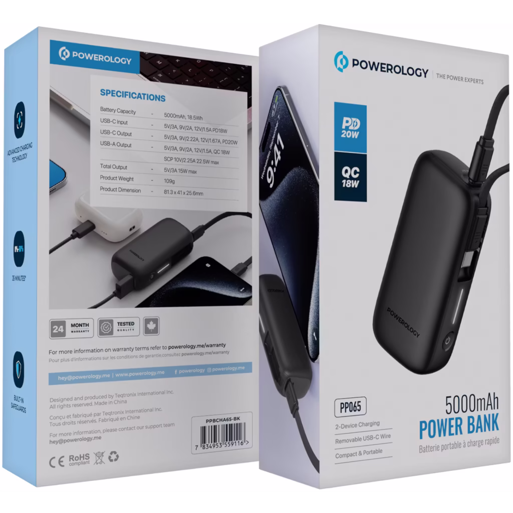 POWEROLOGY 5000MAH 20W PD PP065 یک پاوربانک قابل حمل با کابل جداشدنی است که ظرفیت ۵۰۰۰ میلیآمپر و توان ۲۰ وات ارائه میدهد. این محصول برای شارژ سریع و راحت دستگاههای هوشمند مناسب است.