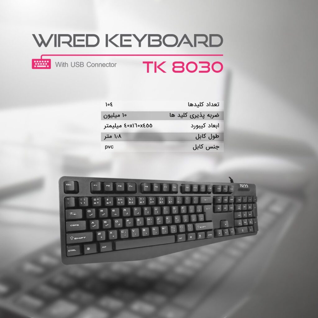 کیبورد TK 8030 از برند تسکو، با طراحی ارگونومیک، کلیدهای کم‌صدا و دوام بالا، گزینه‌ای عالی برای استفاده‌های روزمره، اداری و خانگی است.